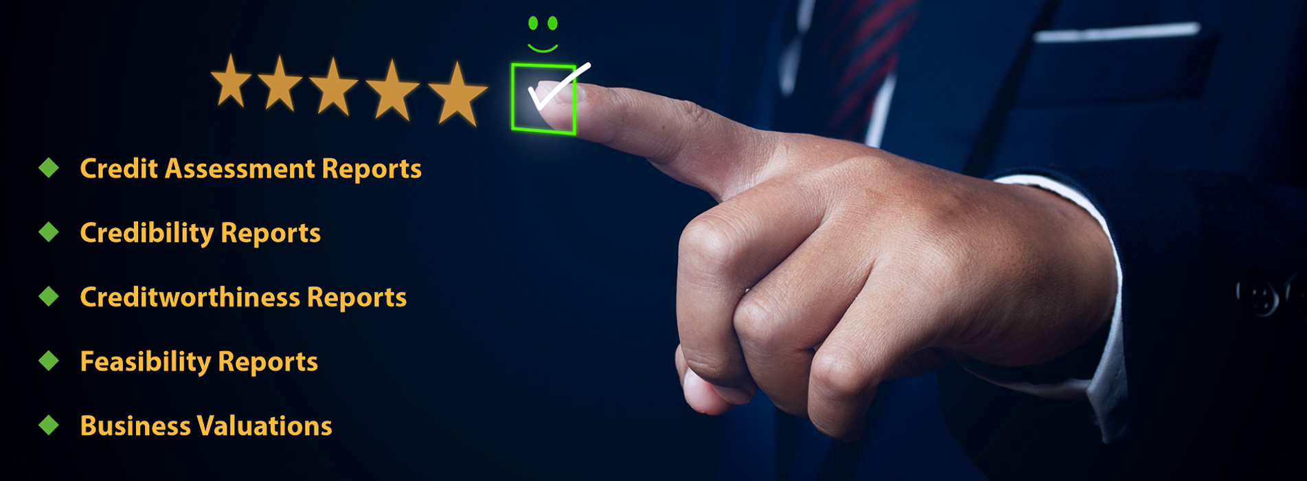 SME Credit Check Private Limited provides services to the various business entities in the form of reports based on the credibility and credit worthiness of the company, business risk assessment, business activities and operations, strategies for business growth & expansion, executive summary of the company, financial status, business management eco-system, financial accounting system, business valuations, business ratings, business plans and prospects for future growth and expansion, revival strategy in the difficult situations, strategies and relations with the suppliers, buyers, vendors and clients, unique strategies & initiatives to attract investors and strategic partners, quality standards of products and services, international business relations, assessment of good governance, business ethics and fair business practices, acquaintance of advanced technology and digital eco-system for branding and marketing, strategies for establishing business co-operation with the national and international business partners, suppliers, manufacturers, buyers, investors and distributors for strategic business alliances.